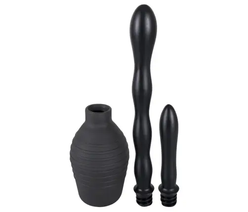 Douche intime noire (13 cm de haut, capacité 300 ml) avec deux embouts interchangeables à visser avec des buses de pulvérisation. Facile à nettoyer. Attache longue et ondulée : longueur totale d'environ 23 cm, Ø 1,7-3 cm. Attache courte et lisse : environ 11,5 cm de long (Ø 1,9-2,3 cm). Matériau : PVC.
