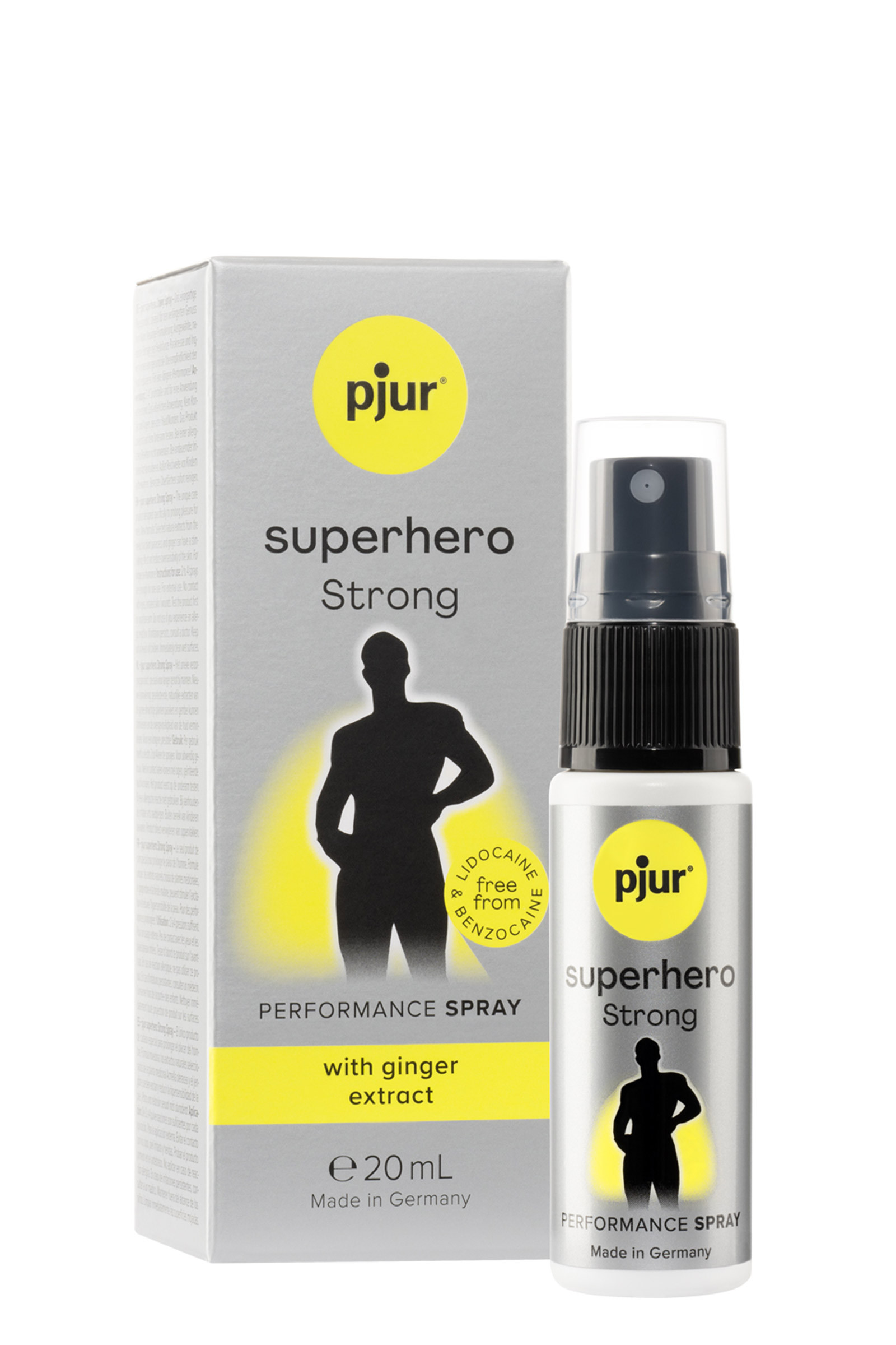 Pjur Superhero Strong Performance est un spray retardant pour homme. Un produit de soin intime conçu pour un plaisir prolongé qui réduit l'hypersensibilité grâce aux extraits de gingembre.
